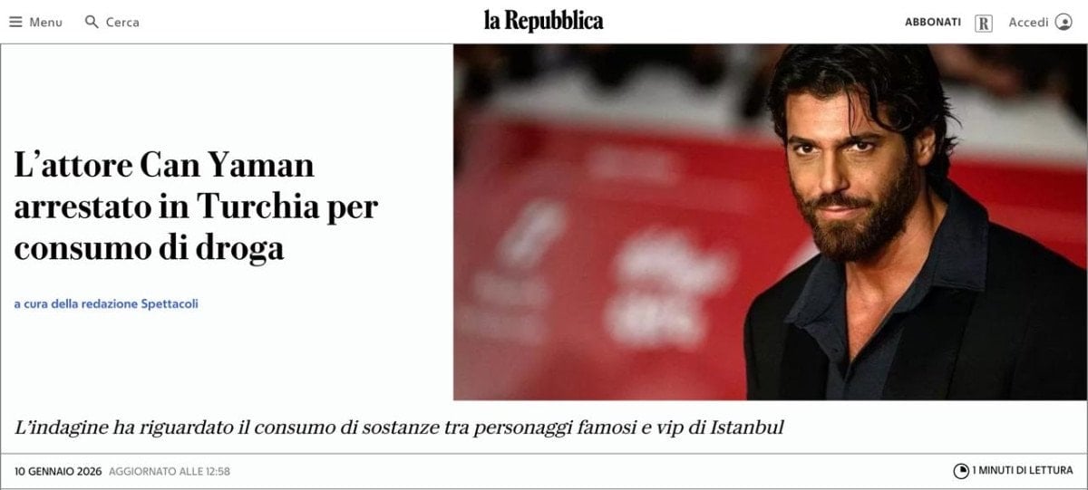 La Repubblica, “Oyuncu Can Yaman Türkiye’de uyuşturucu kullanımı nedeniyle gözaltına alındı” şeklindeki haberinde, Yaman’ın İtalya’da popülerliğine vurgu yapıyor. İtalyanca diline hakimiyeti ve başarılı televizyon dizilerindeki performansıyla dikkat çeken Yaman’ın gözaltına alınan 6 kişiden biri olduğunu belirtiyor.